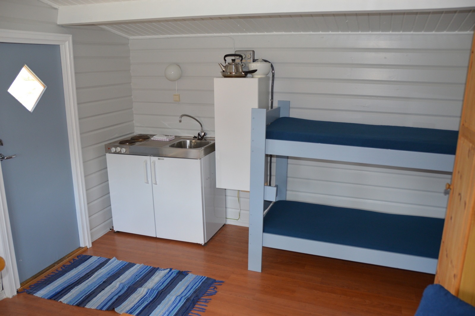 Ett-roms hytter med en køyeseng og sovesofa.